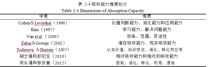 20 世纪 90 年代,Cohen 和 Levintha 首次概括了吸收能力的概念,并把其定义为企业筛选评估、消化以及利用自身内部以外的新知识,然后将其商业化的一种能力[118]。大部分学者都认同上述观点,在研究吸收能力时,也多是从组织的视角。如国内学者王雎(2007)指出吸收能力是组织所具备的基于组织间合作关系基础之上的一种跨组织能力[119]。邹艳和张雪花(2009)根据创新过程中知识传播扩散特征,指出吸收能力是企业自身所具备的一种动态能力,主要指其对从自身以外取得的新知识进行评估、吸收、转化以及应用等四个方面的能力[120]。解学梅,左蕾蕾(2013)与之观点相似,指出吸收能力是企业对自身以外的新知识不断进行探索的动态能力,是获取、转化、吸收和利用这些新知识的一个动态过程[121]。还有一部分学者从个体的视角对吸收能力进行研究。如 Lane 等(2006)指出吸收能力是组织内部员工通过吸收与其他同事交流和互换取得的自身并不具备的新知识后,把它与自己现有的知识进行整合,继而创造出新知识的能力[122]。宋姝婷(2013)以客户经理个体为研究主体,探究了个体的吸收能力在社会资本与知识转移关系中起到的调节作用[123]。